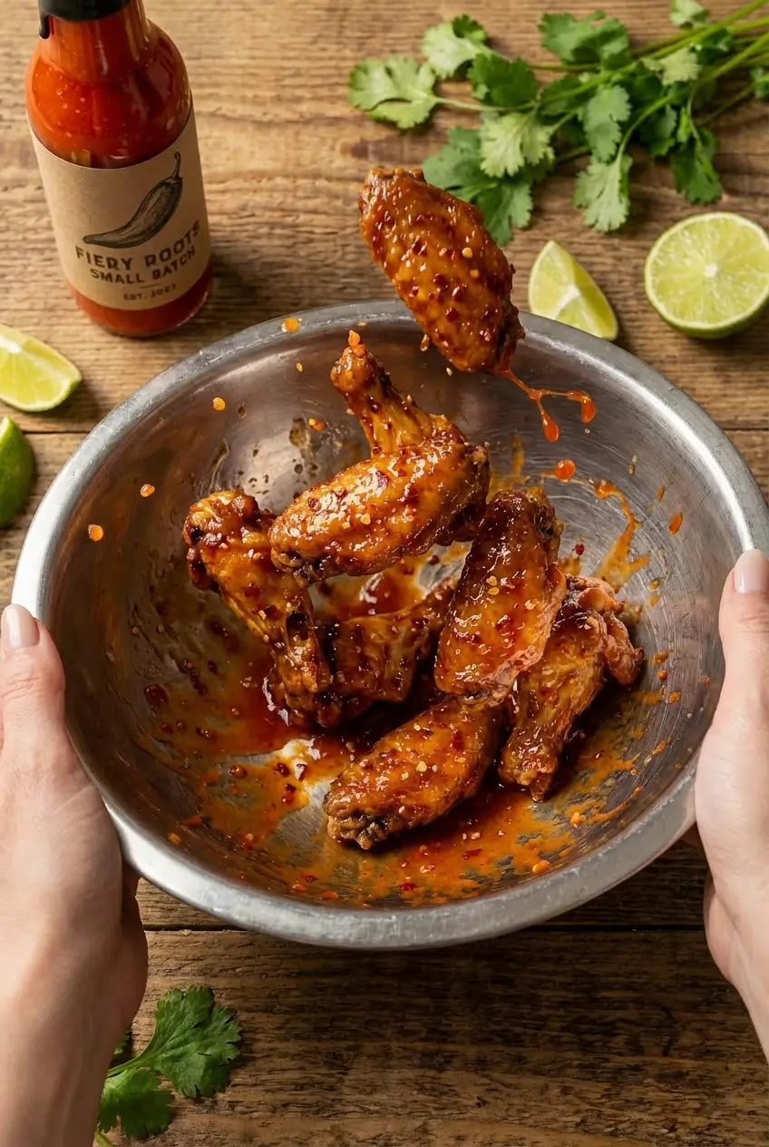 "Spicy honey glazed chicken wings. 6 quick steps, overhead..."